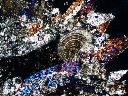 尿路結石を薄片にしたものの偏光顕微鏡像。光の屈折率の違いが色の違いとなる(2023年 …